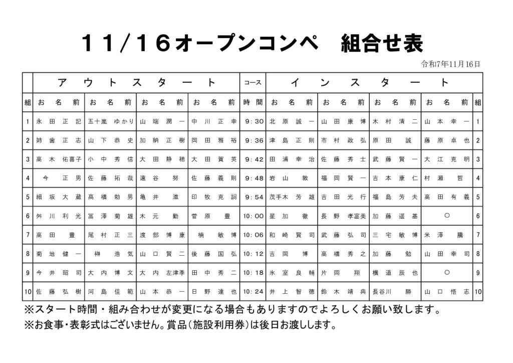 11月16日オープンコンペ 組合せBy 北見カントリークラブ / 2025年11月14日 1116組合せhttps://kitamicc.jp/wp-content/uploads/2025/11/1116組合せ表-2.pdf